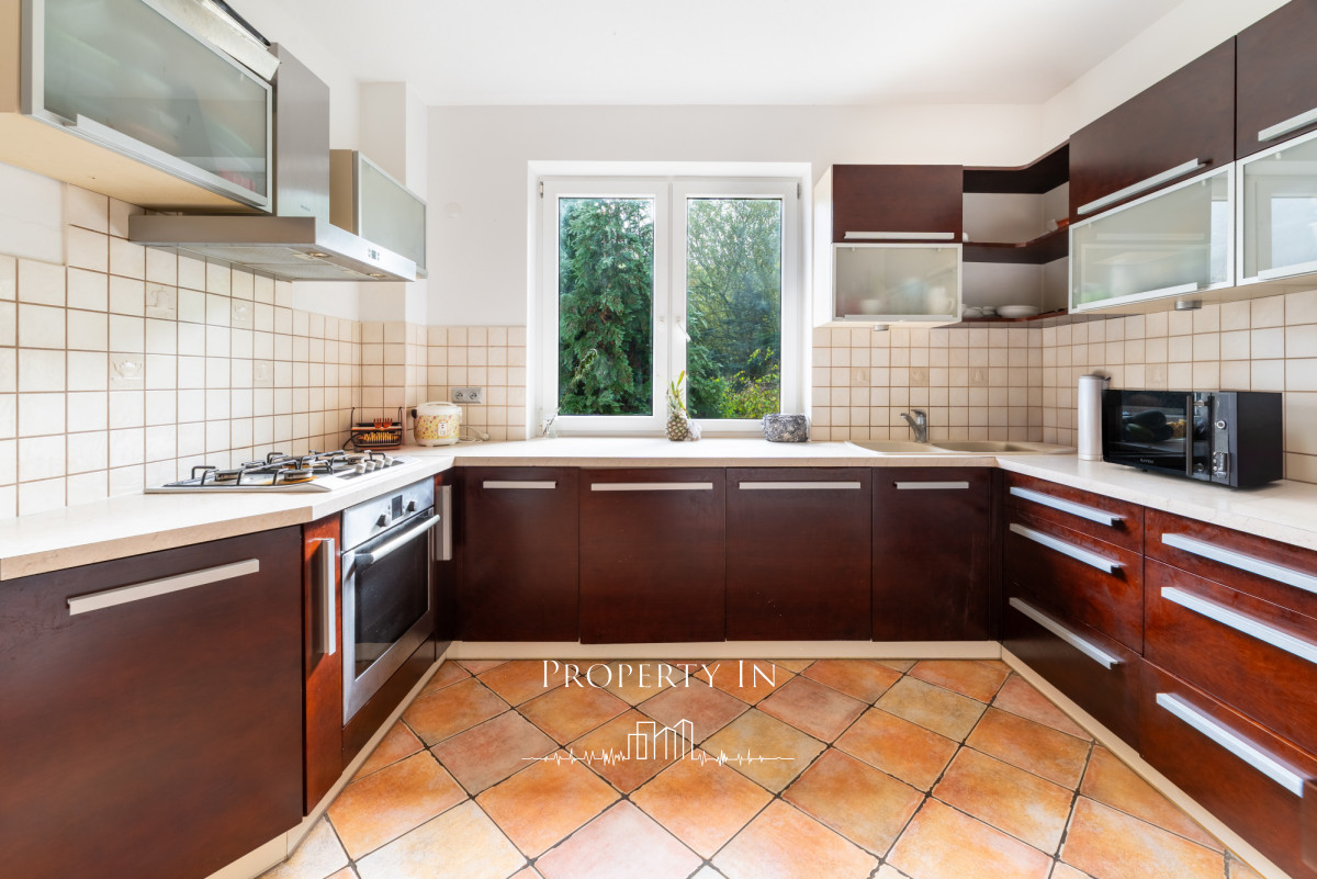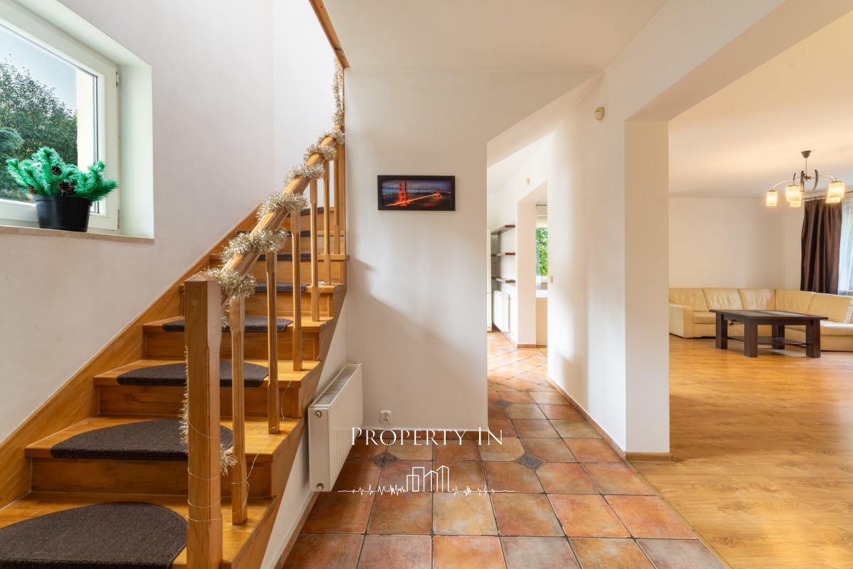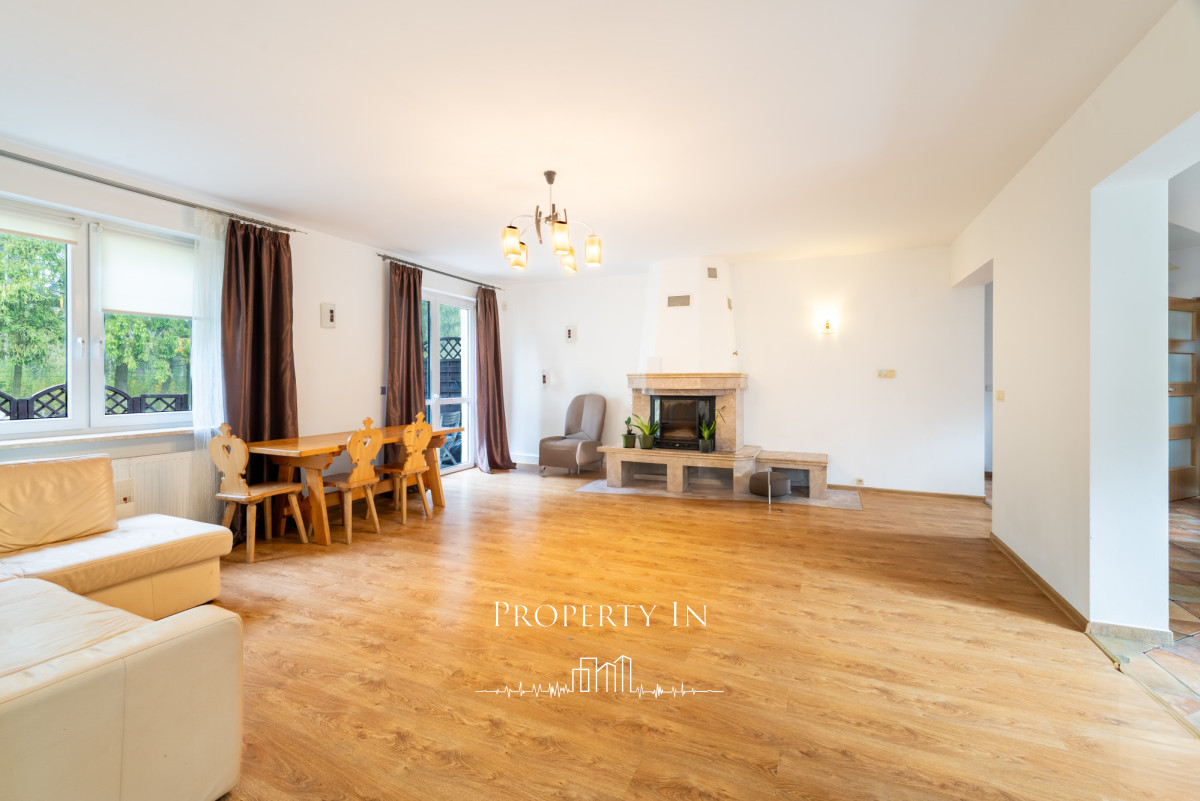 Na dwóch poziomach znajdują się łącznie 6 przestronnych pokoi, w tym salon z kominkiem i wyjściem na taras, który otwiera się na ogród i ścianę lasu.