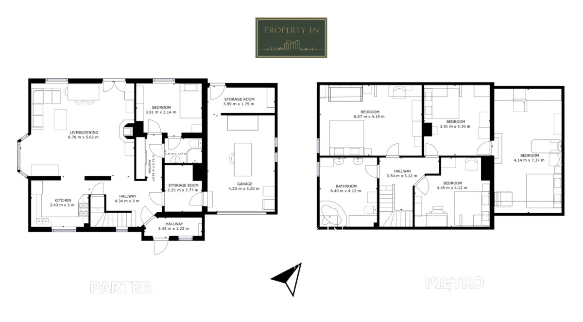 • Parter: przestronny salon z jadalnią i otwartą kuchenią, pokój gościnny lub gabinet, łazienka, pokój, pomieszczenie gospodarcze, garaż z kanałem samochodowym.