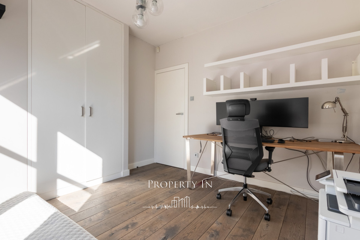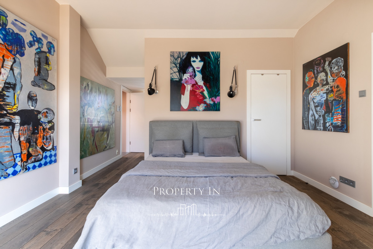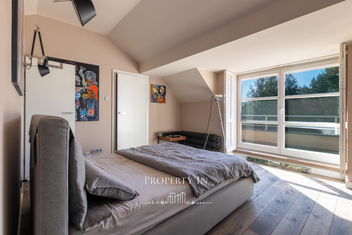 Drugie piętro:Główna sypialnia na całym poziomie o powierzchni około 22 m² to wyjątkowo jasne i przestronne pomieszczenie, które zapewnia komfort oraz funkcjonalność. Na piętrze zlokalizowana jest także przeszklona łazienka z prysznicem. Dzięki dużym panoramicznym oknom na dwóch ścianach wnętrze jest doskonale doświetlone naturalnym światłem przez cały dzień. Z sypialni bezpośrednie wejście do garderoby. Dodatkowym atutem jest bezpośrednie wyjście na dwa tarasy, które pozwala cieszyć się świeżym powietrzem o każdej porze dnia.