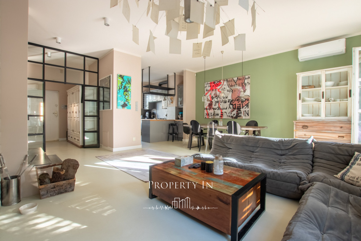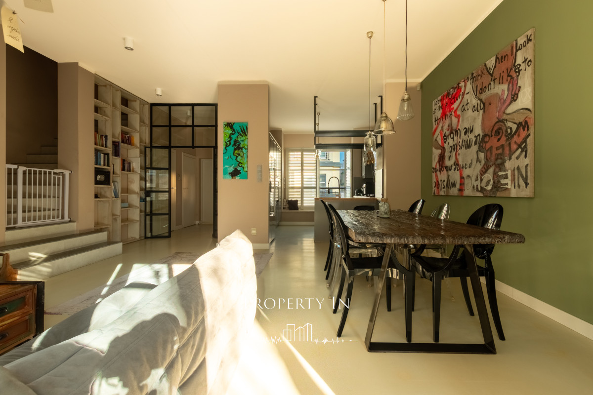 ParterOtwarta przestrzeń o powierzchni około 50 m² zachwyca swoją funkcjonalnością i elegancją. Dzięki panoramicznym oknom wnętrze jest pełne naturalnego światła, co podkreśla jego wyjątkowy charakter i sprawia, że jest idealnym miejscem zarówno do relaksu, jak i spotkań z bliskimi. W części wypoczynkowej znajduje się kanapa i stolik kawowy. Obok umieszczono duży stół z krzesłami, który świetnie sprawdzi się podczas wspólnych posiłków.