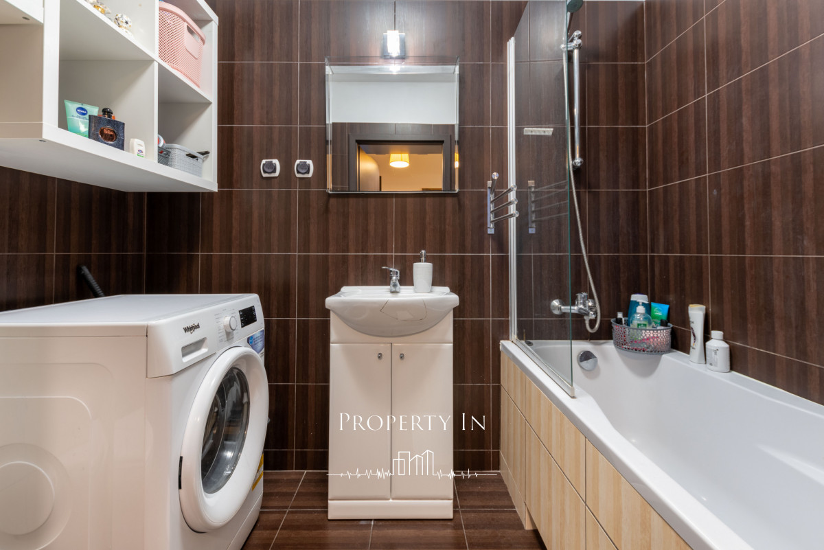 Mieszkanie jest wyposażone w sprzęt AGD (pralka, lodówka, zmywarka, płyta gazowa, piekarnik). W łazience znajdziemy wannę z szybą prysznicową - bardzo wygodne rozwiązanie.
