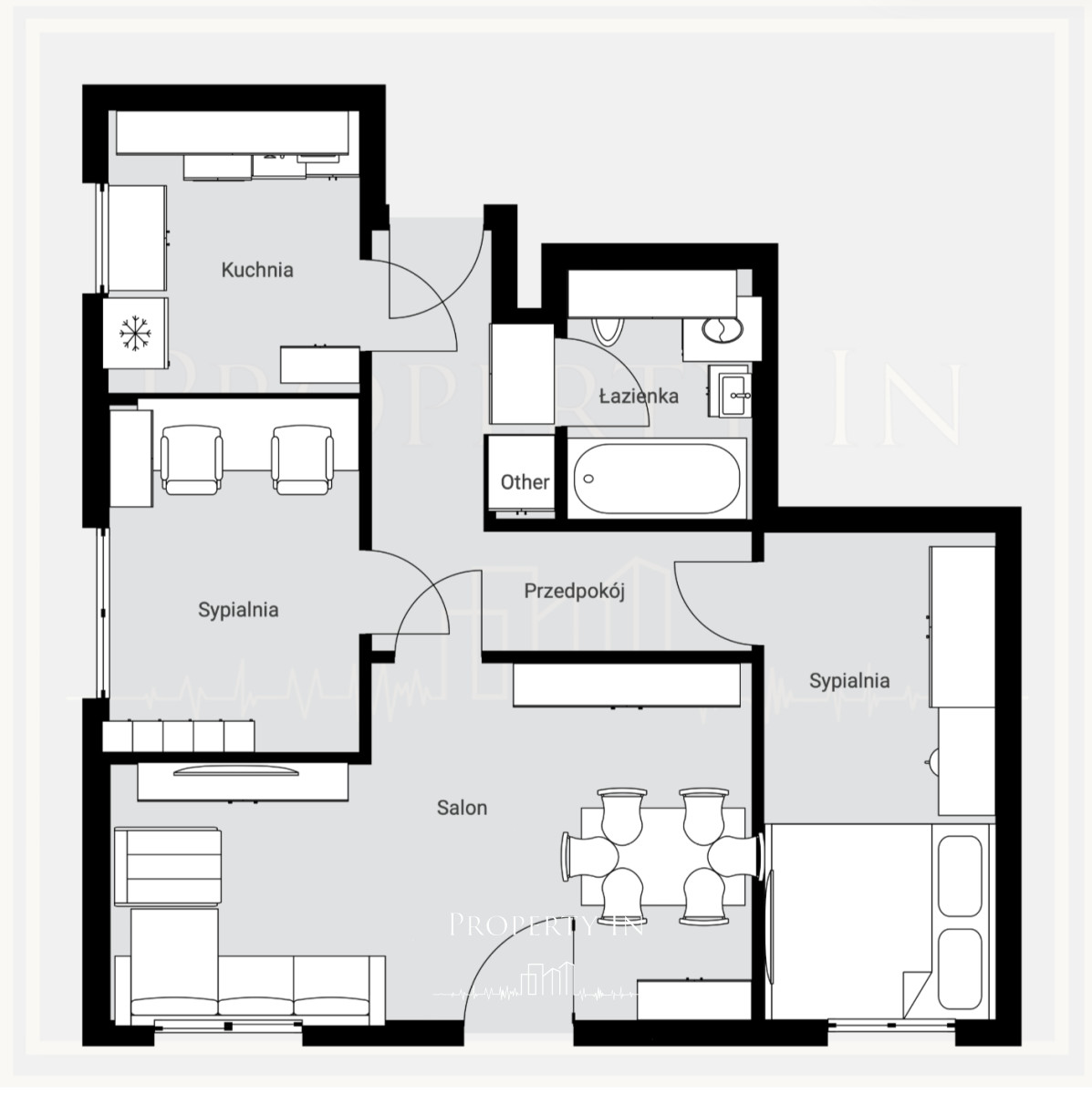 Rozkład: Salon + 2 sypialnie + oddzielna, widnia kuchnia + łazienka z WC + przedpokój