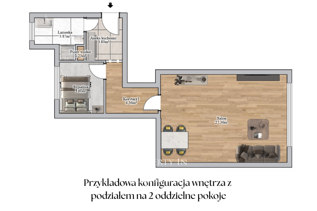 Dzięki funkcjonalnemu układowi i wysokości pomieszczeń istnieje możliwość wydzielenia oddzielnej sypialni oraz przeniesienia aneksu kuchennego do salonu, co znacząco podnosi komfort codziennego życia i wartość inwestycyjną nieruchomości.