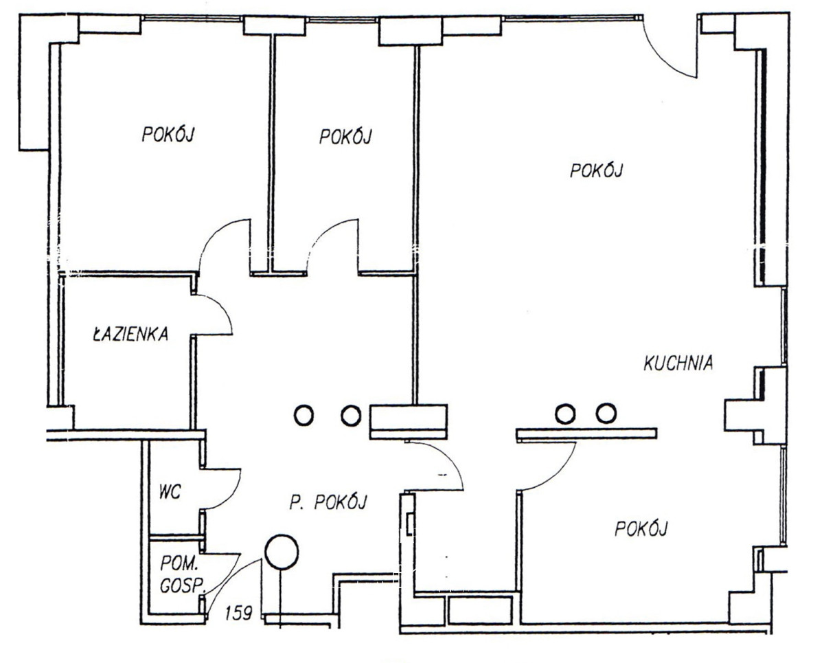 Mieszkanie jest aktualnie podzielone na pokoje (i wynajmowane). Pierwotny plan lokalu